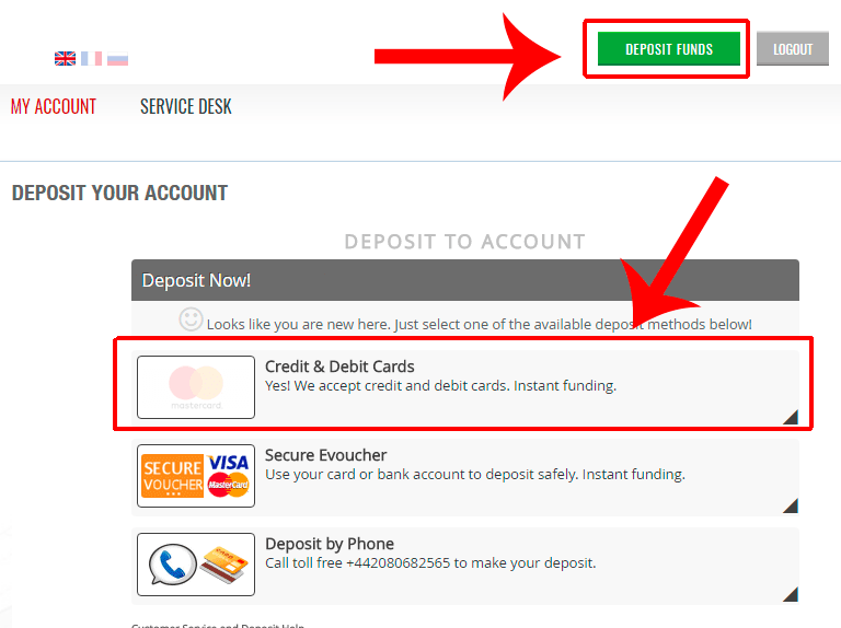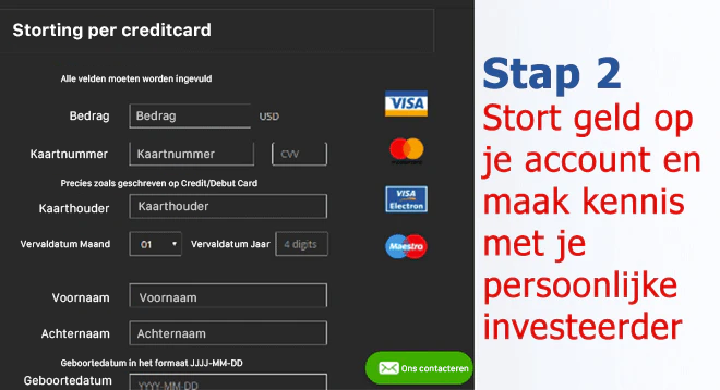 U kunt uw rekening financieren via een creditcard of een bankoverschrijving. Er zijn twee stappen om te beginnen: